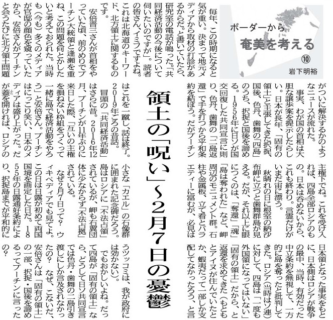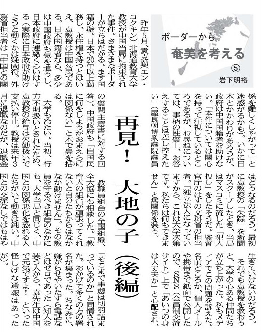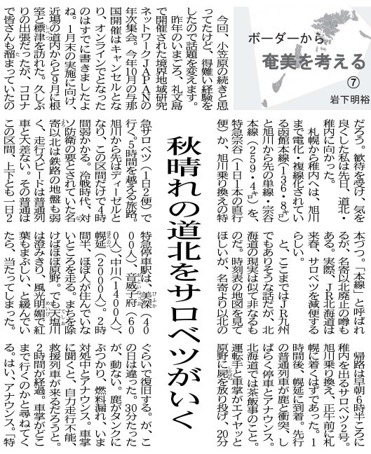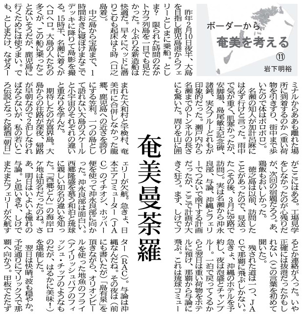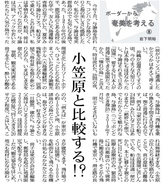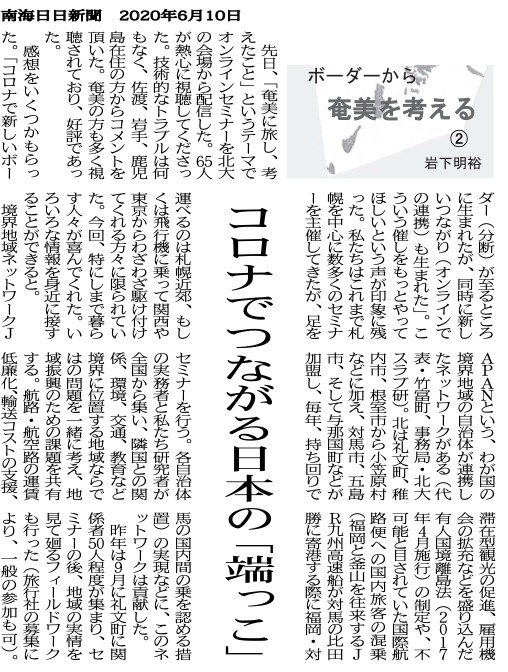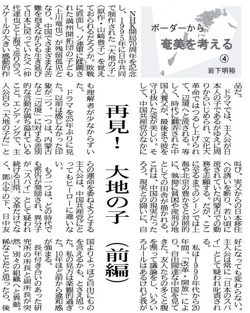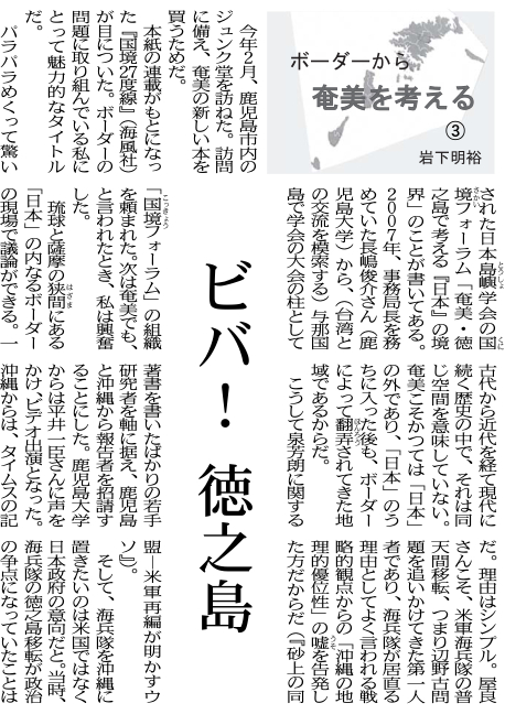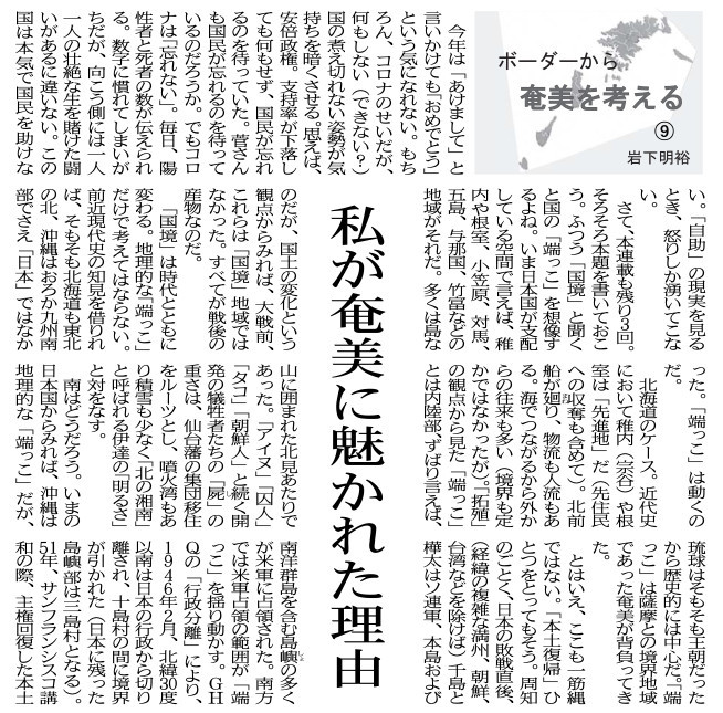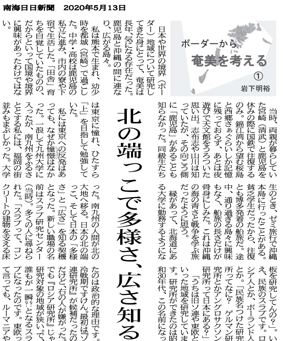 南海日日新聞文化面掲載:『ボーダーから奄美を考える』本NPO副理事長 岩下明裕氏