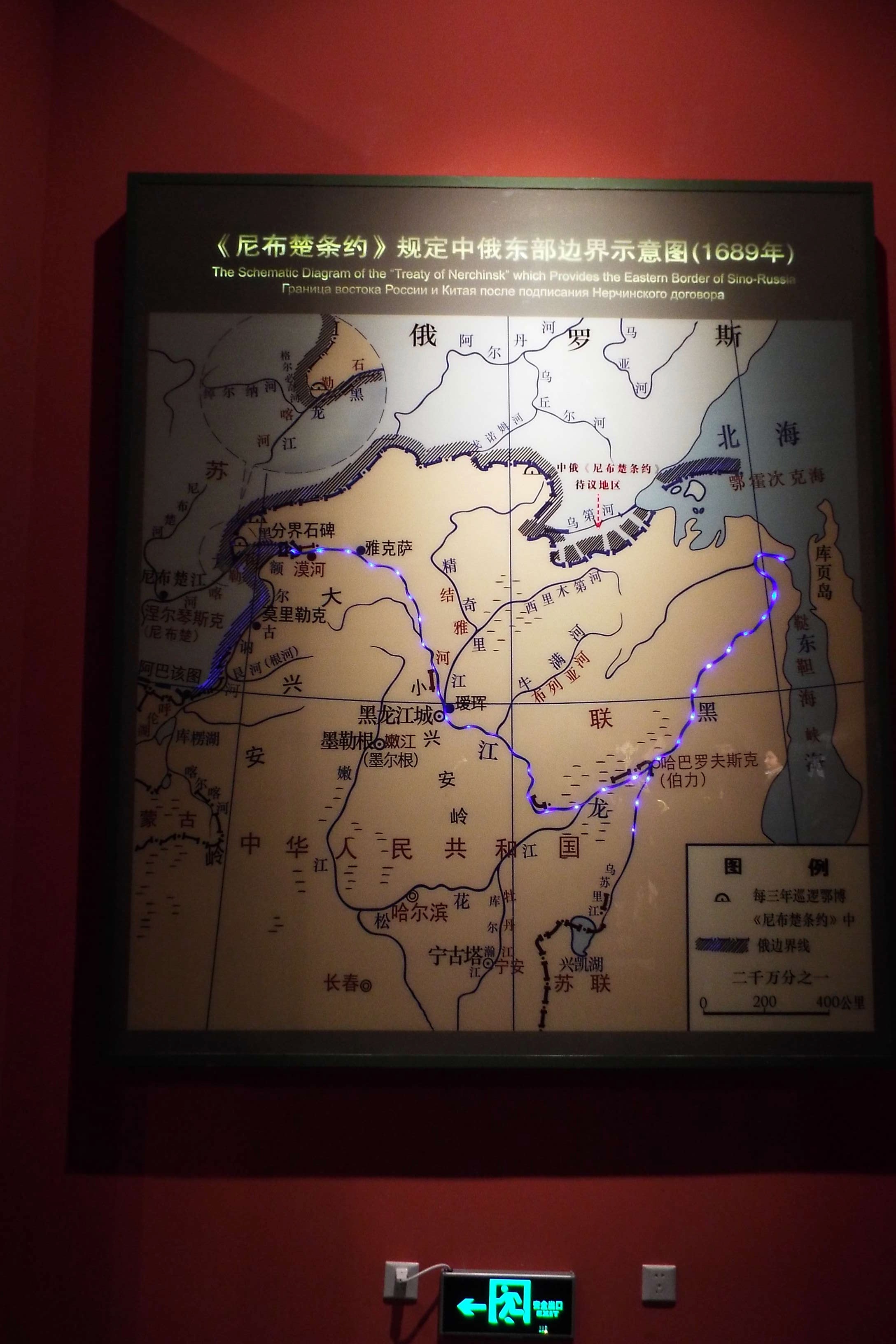 ではその中身はどうかというと、私には大きな不満が残った。たとえばネルチンスク条約については札幌滞在中に多少勉強していたので、清国側にもロシア帝国側にも双方が国境画定に異議なく同意できるような正確な地図は存在しなかったことを知っていた。しかし、陳列館に示された地図は、今日の政治地図の精度で描かれている(写真5)。今日の観点からすれば、条文自体に法理的不備があることはたしかである。現にそれから160年を経てロシアが愛琿条約締結を強要出来た裏には、アムール河の河口付近の帰属が、ネルチンスク条約の条文からは確定できないとするロシア側の主張(我田引水的ではあるが)に押し切られたからなのである。