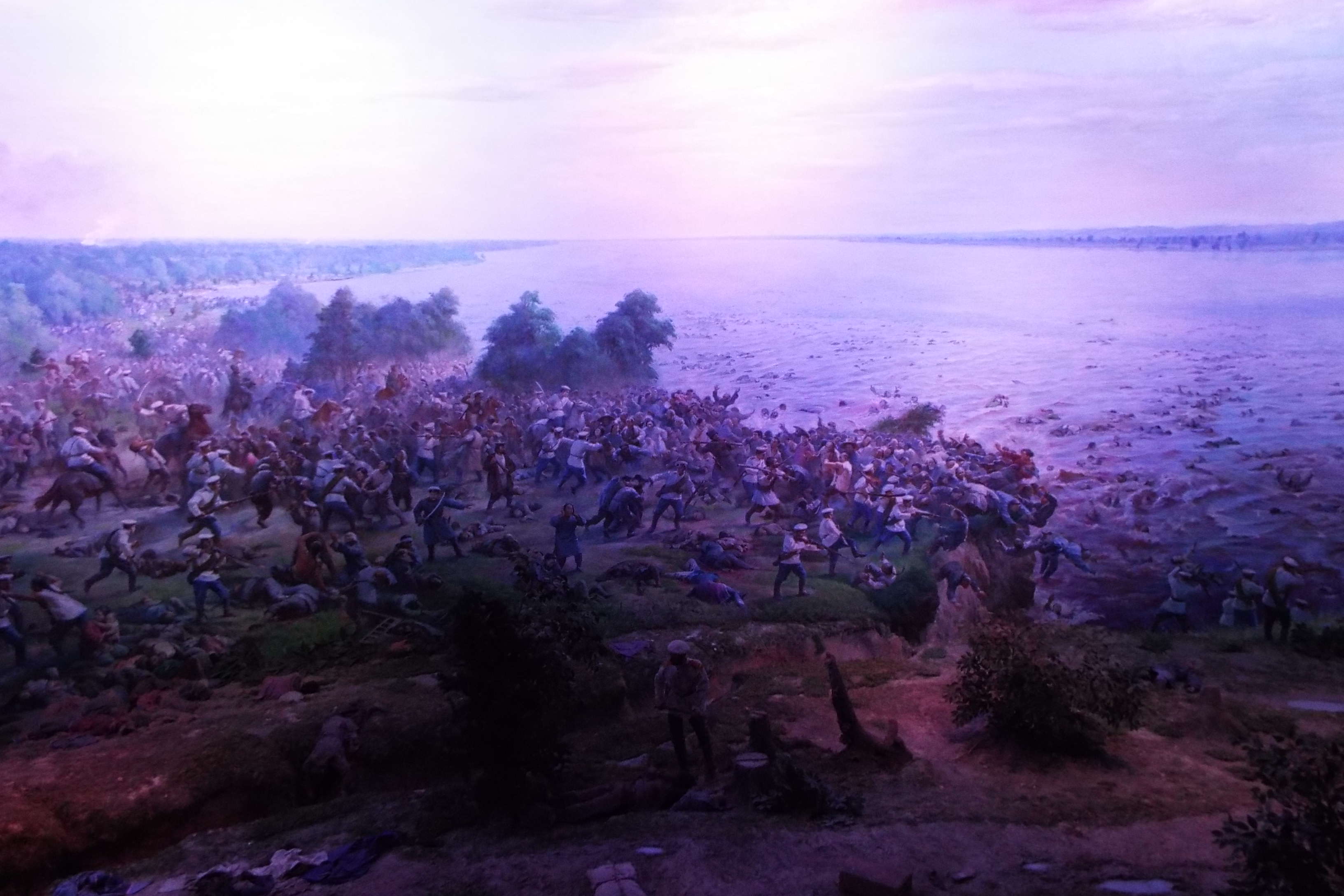 一通り見学を終えたあと、館長が懇談会に招いてくれた。主任学芸員の方も列席されておられたが、通訳の問題もあって、私の問題指摘はどうにも相手に通じなかった。「ブラゴ事件」を音響と光を使って再現する大規模なパノラマ館があった(写真7)。たしかに臨場感は得られる。しかし、どうしてこのような悲劇が起こったのか、どこに清露間の齟齬があったのかはよく分からない。展示物を見てもレーニンや、当時事件を目撃者した日本人の石光真清の「証言」がそのまま掲げられている。資料批判の手続きを省いて「いいとこどり」する姿勢からは、この歴史陳列館が歴史研究の成果を示すことより、「愛国教育」の機関としての機能を重視しているという印象を強く受けた。ロシア国民は入館を許されていない、ときいてさらに驚いた。それならロシア語の解説文は誰のためのものなのだろうか。館長は一人のロシア人歴史家を招いたことがあったことを明かしてくれた。団員のどなたかが「どんな反応でしたか」と尋ねたところ、苦笑いをうかべて「全面的に同意できないといわれた」と答えた。反対に中国からブラゴへ渡って郷土博物館を見学しても、同じような結果に終わるに違いない。はたしてこれでいいのだろうか。