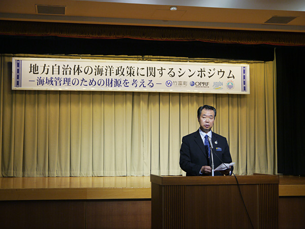 主催者である竹富町の川満栄長町長の開会挨拶と沖縄県企画部の比嘉徳和企画調整統括官の挨拶で幕を開けた今回のシンポジウムは、沿岸・離島自治体における海域管理とその財政問題に焦点を当て、同様の問題を抱える全国の自治体との連携を図るために企画されたものです。
