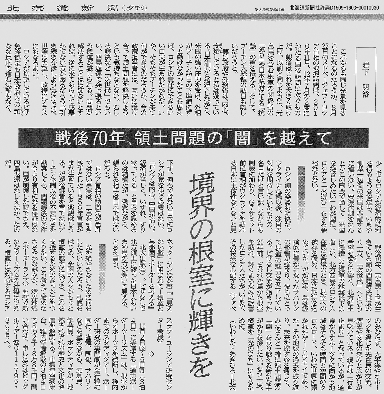 ●岩下明裕「境界の根室に輝きを」『北海道新聞』(2015年9月2日付夕刊) >>>[CLICK]